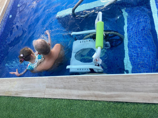 Wenn ein „Angel“ fürs Leben gerne badet, der Rollstuhl aber nicht im Schwimmbad zugelassen und auch unpraktisch ist, kann ein Duschstuhl eine gute Alternative sein.