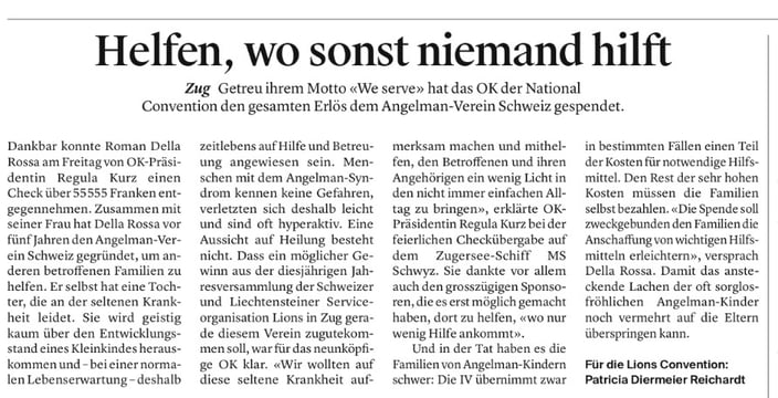 Wir sind tief berührt und dankbar über die zweckgebundene Spende von 55`555.- zugunsten des neu entstehenden Hilfsmittel-Fonds des Angelman Verein Schweiz. Das Geld wird für Hilfsmittel und Therapien eingesetzt, welche die IV nicht übernimmt. Es freut uns sehr, dass wir damit unsere knapp 50 Angelman Familien aus unserem Verein direkt finanziell entlasten können.
