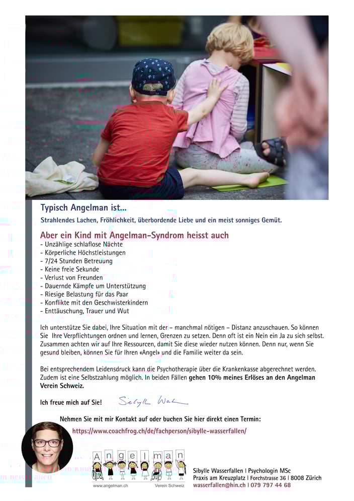 Ein geschätztes Solidarmitglied von uns bietet Beratung und Therapie in schwierigen Lebenssituationen an und spendet dabei 10% des Erlöses dem Angelman Verein Schweiz.
