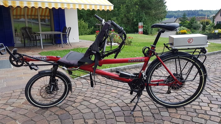 Endlich konnten wir unser Tandem mit dem grossen Akku ausrüsten und so die Motorisierung abschliessen. Die verbauten Komponenten sind alles Eigenentwicklungen von Herrn Frei, der diese in alle möglichen Zwei-, Drei- und Vierräder einbaut. Der Motor leistet 500 Watt. Zusammen mit einem 48 Volt Akku mit 960 Wh und 20 Ah hat man so genügen Kraft um auch ohne Pedalen zügig voran zu kommen.