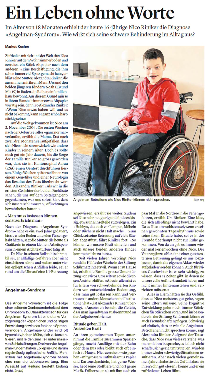 Danke unserer langjährigen Angelman Mitgliedsfamilie für diesen berührenden und aufklärenden Bericht in der Aargauer Zeitung über ihren Sohn Nico und das Angelman-Syndrom. Wir danken euch von Herzen für euer Engagement und das „nach aussen“ gehen mit eurer Geschichte.
